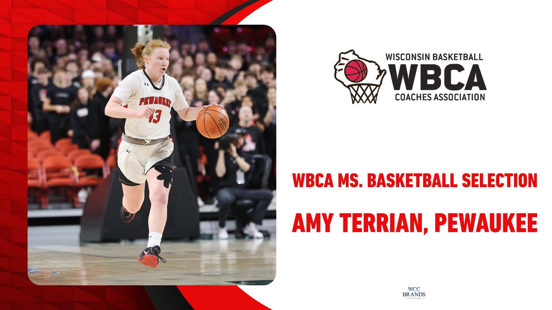 Pewaukee senior Amy Terrian has been named the 2025 Ms. Basketball recipient by the Wisconsin Basketball Coaches Association (WBCA), presented by Wisconsin Clothing Company.
